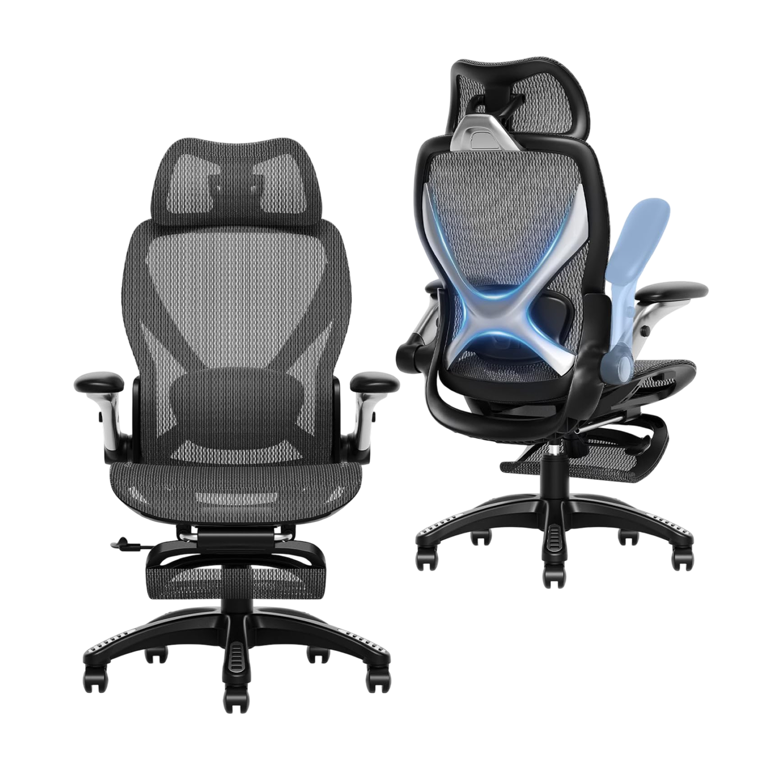 The space-saving 5D flip-up armrests are revolutionary, allowing the chair to tuck completely under standard desks. Combined with the 18" extendable footrest, it creates exceptional versatility for small home offices.